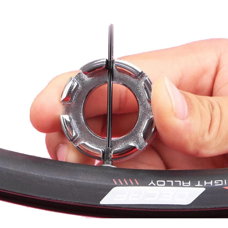 La clé de rayons possède toujours une encoche en face de l’écrou a serrer afin de pouvoir serrer l’écrou bien dans son axe.