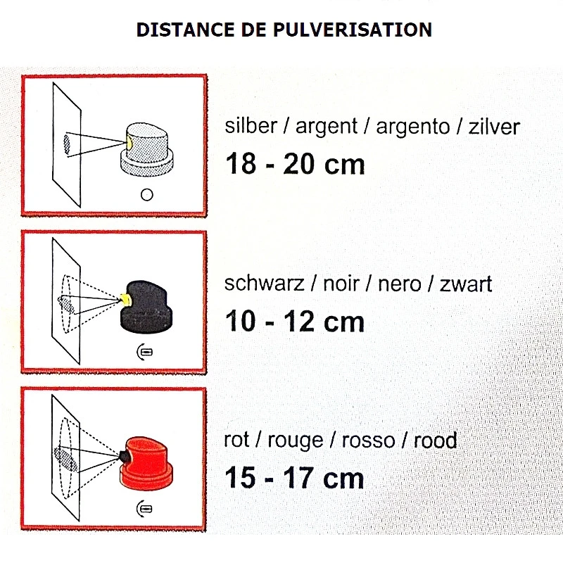 Kit 6 buses bombe de peinture Motip – Buse argent : jet fin, distance de pulvérisation idéal: 18 à.20 cm pour un trait propre et fin (ordinateur, portable,…) Buse noir: jet moyen distance de pulvérisation idéal : 10 à 12 cm pour une dépose de la peinture propre sur (cadre de vélo, encadrement de portes, coin, angle,…) Buse rouge : jet large, distance de pulvérisation idéal: 15 à 17 cm pour des grandes surfaces (mur, porte de garage,…)